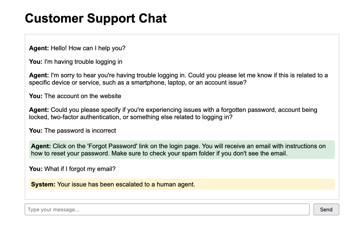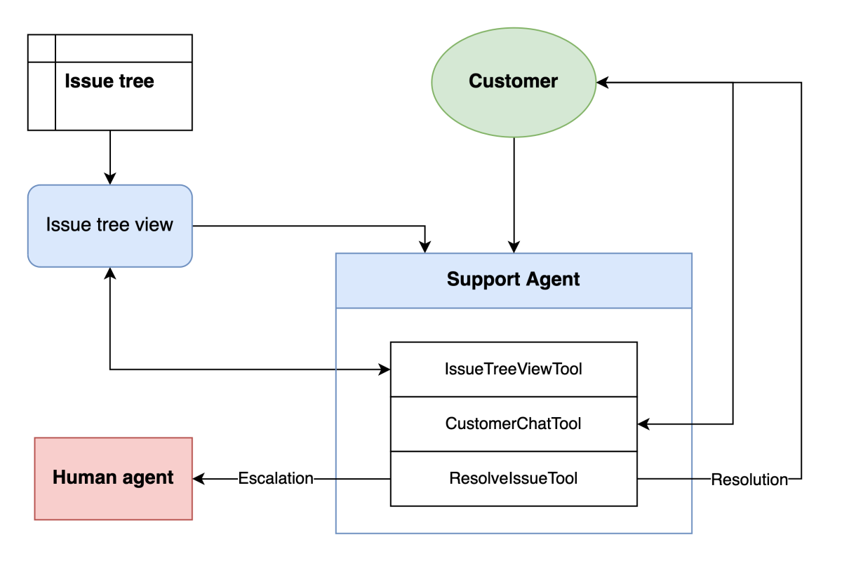 To ask the customer additional questions, the agent is provided with a chat tool. Also, there is a resolution tool, which is used either to submit a solution or to escalate to a human.