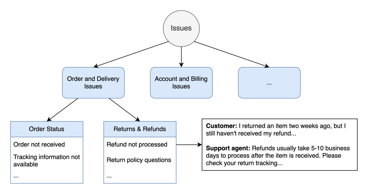In the heart of the support chatbot lies the issue database. It stores information about what issues can arise and how they can be solved in the form of a tree, where the intermediate nodes are the issue categories, and the leaves are the individual issues. The simplest way to compose such a tree is to use the information about past issues solved by a human support agent. If they are not already categorized, it can be done using an LLM.