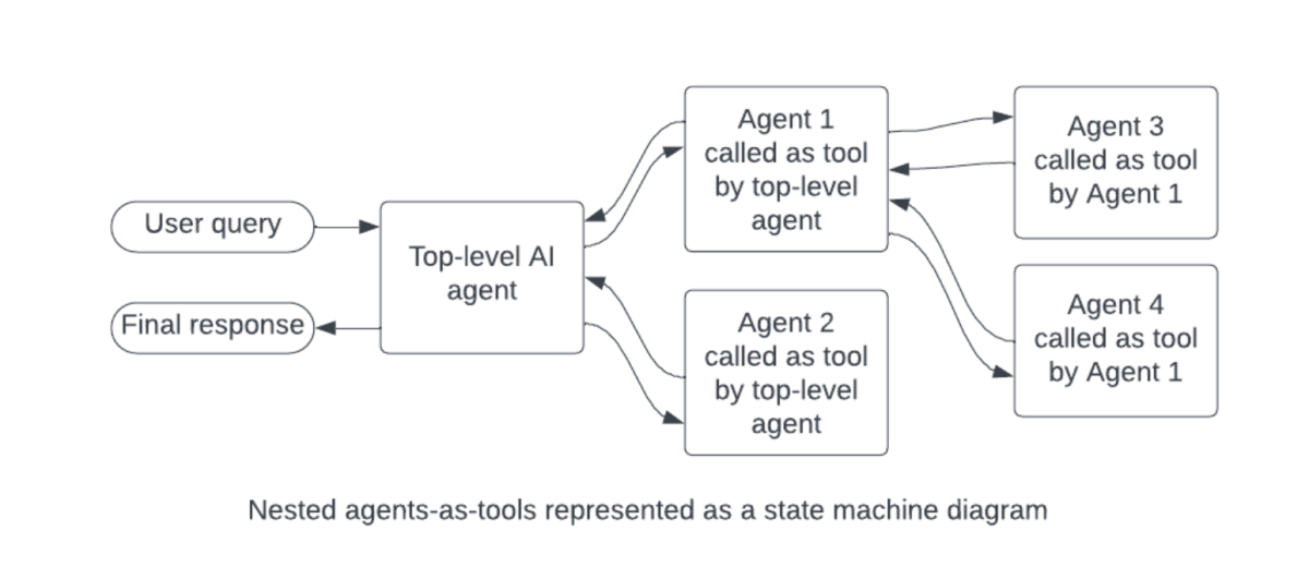 Langgraph currently positions itself as an advanced way to create the state machine of an individual agent, but as the graph nodes can just as easily themselves be agents, it can also be used for multi-agent orchestration. The graph nodes can themselves also be Langgraph graphs, so arbitrarily complex constructions can be achieved. In particular, a pattern with multi-layer agents-as-tools that we discussed in earlier blogs of the series can be represented as such a graph, whereas the converse is not true: one can come up with sufficiently complex graphs that can’t be represented using the tool-calling pattern.